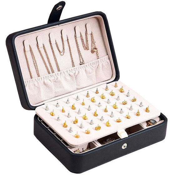 , W szkatułce znajduje się: 5 haczyków na naszyjnik lub bransoletkę, organizer na kolczyki, miejsce na pierścionki lub brożki